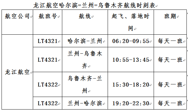 为满足暑期航空市场需求,进一步积极拓宽进疆通道、满足广大旅客出行需求,从7月10日起,兰州中川国际机场正式引进龙江航空执行的LT4321/2哈尔滨-兰州-乌鲁木齐航线。