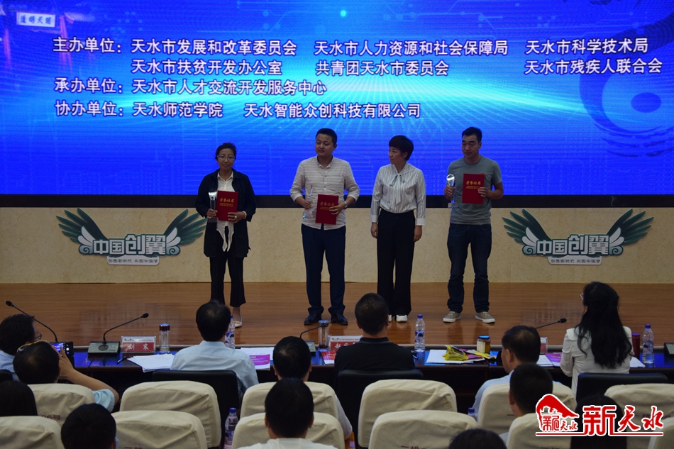 新天水讯【天水日报记者 童强】7月14日,由天水市发展和改革委员会、天水市人力资源和社会保障局、天水市科学技术局、共青团天水市委员会、天水市扶贫开发办公室、天水市残疾人联合会主办,天水智能众创科技有限公司协办的第四届“中国创翼”创业创新大天水市选拔赛暨天水市第一届创业创新大赛在天水师范学院举行。省人社厅二级巡视员闫敬明,副市长逯克宗出席活动并为获奖选手颁奖。