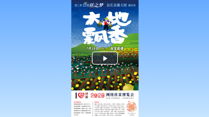 7月18日16:00,I@甘肃2020网络扶贫博览会,第二季“甘货夏之梦”,“县长直播天团”第四场直播,“大地飘香“新鲜上映,“芬芳盛宴“邀您共赏!