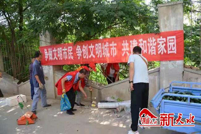新天水讯 为做好创建全国文明城市迎检工作,全面提高社区卫生环境清洁水平,彻底解决“脏、乱、差”现象。7月17日上午,七里墩街道海林社区对龙王沟东侧因早市摊贩造成的大量垃圾进行了全面清理清运。