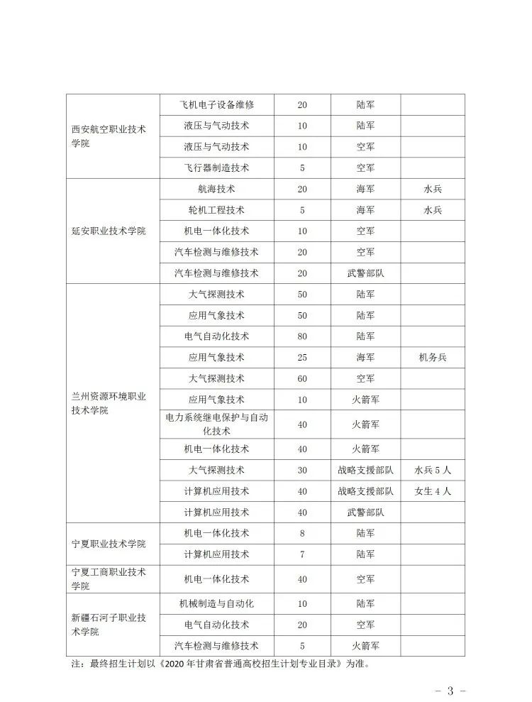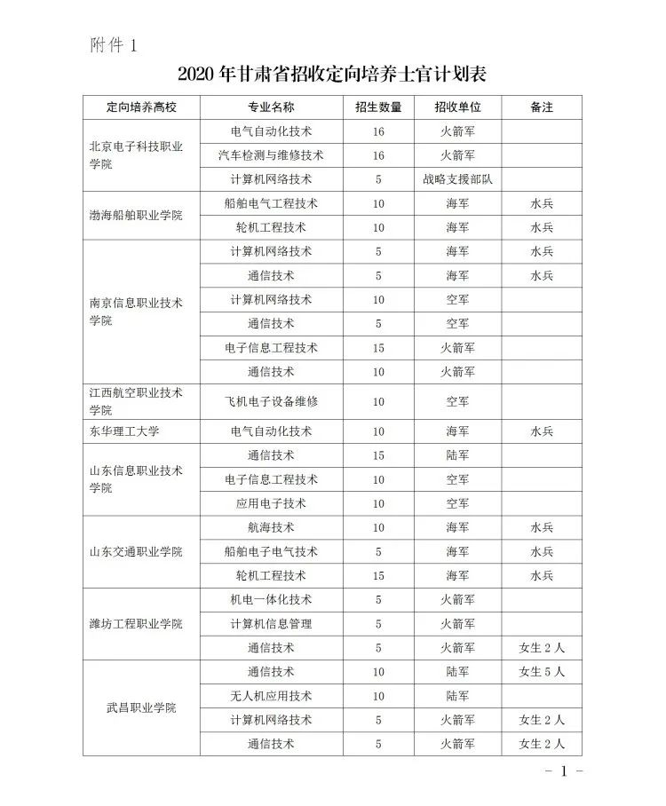 全国22所地方高职院校在我省招收定向培养士官1247人。我省2020年定向培养士官招生计划已在《2020年甘肃省普通高等学校招生专业目录》(上册)中公布,并单独编制直招士官生院校代码,供考生填报志愿时使用。