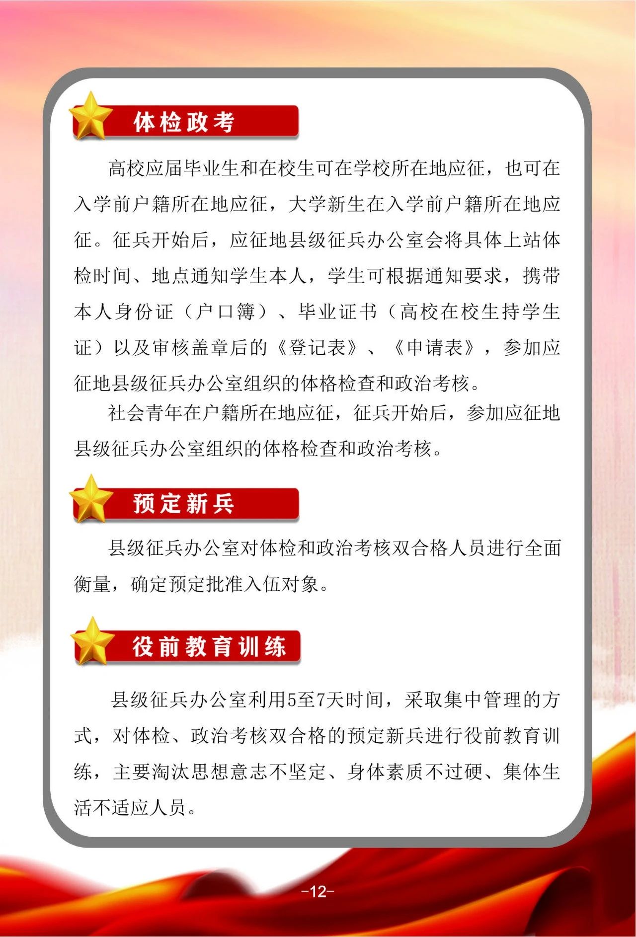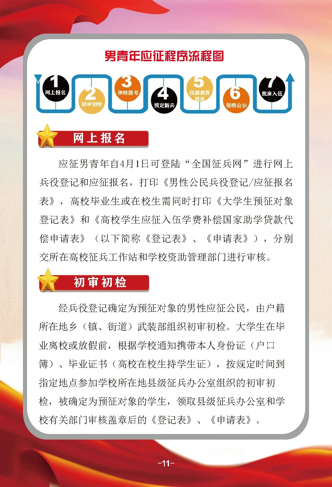 适龄青年应当在其户籍所在地应征,经常居住地与户籍所在地不在同一省(自治区、直辖市)且取得当地居住证3年以上的,可以在经常居住地应征。普通高等学校应届毕业生和在校生可在学校所在地应征,也可在入学前户籍所在地应征,大学新生在入学前户籍所在地应征。应征公民经体格检查、政治考核合格并符合其他征集条件的,由应征地的县(市、区)人民政府征兵办公室批准入伍。男青年应征入伍程序为:网上报名、初审初检、体格检查、政治考核、役前教育训练、审批定兵、张榜公示、批准入伍。