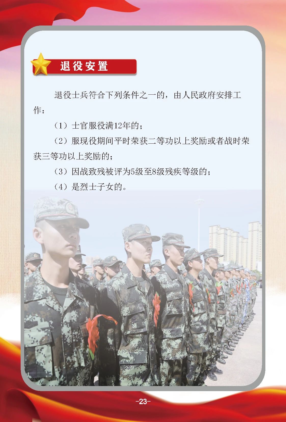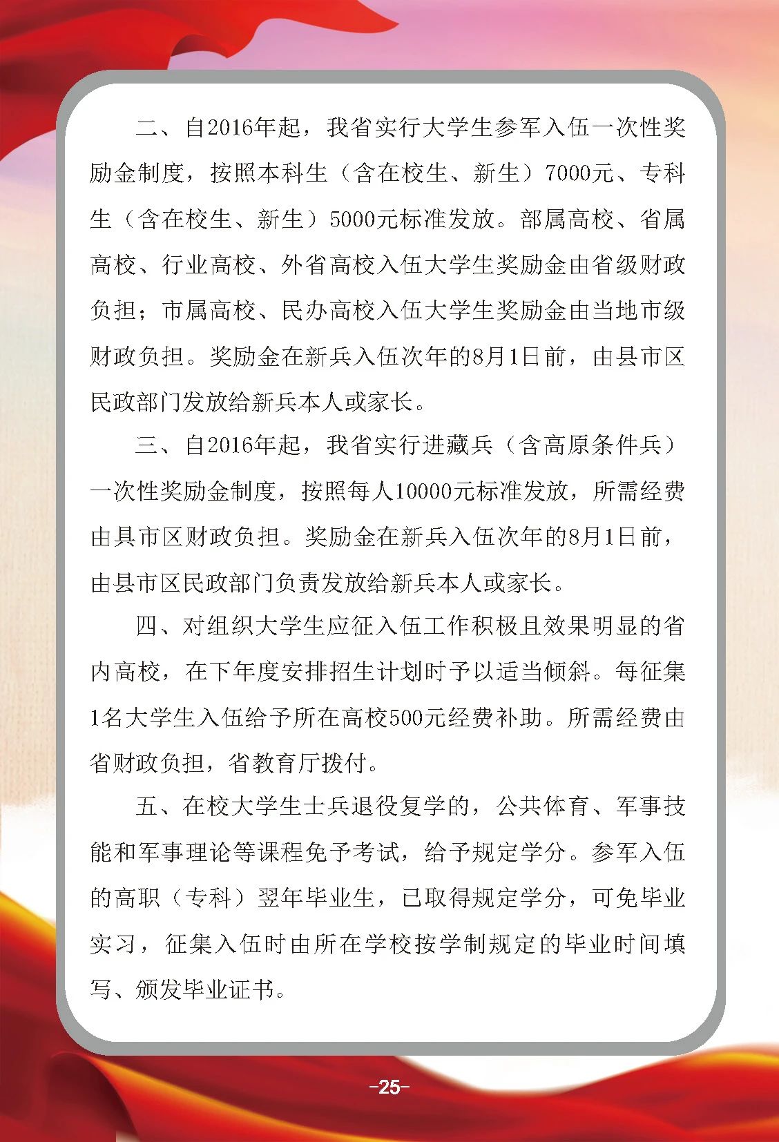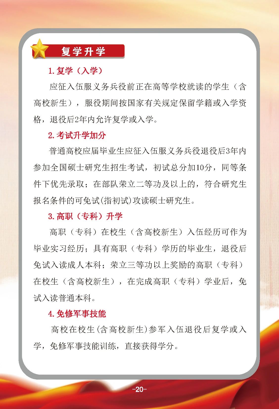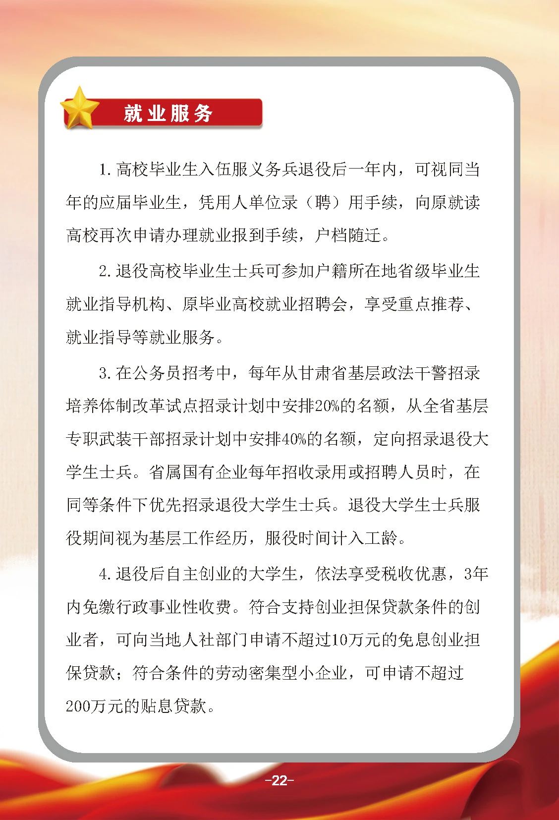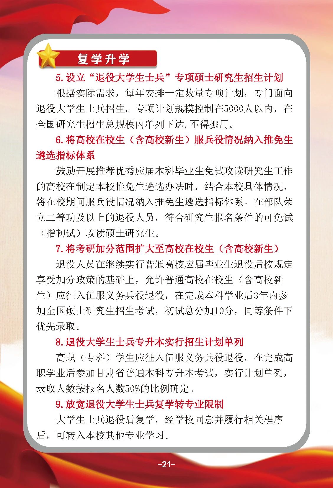 (三)退役就业方面。一是复学升学享受优待。大学毕业生参军入伍的,国家设立了退役大学生士兵硕士研究生招生专项计划,每年在全国研究生招生总规模内安排5000人专项招录退役大学生士兵,计划单列;3年内参加全国硕士研究生招生考试,初试总分加10分,并将服兵役情况纳入研究生推荐、免试遴选指标体系,同等条件下优先录取;荣立二等功及以上的本科生,报考研究生初试时免考。在校生参军入伍的,高职(专科)学生退役后免试入读成人本科,参加专升本考试计划单列,录取比例50%,而且可以根据本人意愿调整专业;退役复学免修军事技能训练和军事理论等课程,直接获得学分;荣立三等功以上大专生,还可以免试入读普通本科。二是就业享受优惠。2016年,省政府、省军区出台了《关于鼓励大学生参军入伍和应征青年进藏服役政策措施》,在鼓励就业方面具体措施:每年从全省基层政法干警招录培养体制改革试点招录计划中安排20%的名额,从全省基层专职武装干部招录计划中安排40%的名额,定向招录退役大学生士兵。省属国有企业每年招收录用或招聘人员时,在同等条件下优先招录退役大学生士兵。此外,服役满12年或平时荣获二等功、战时荣获三等功以上的,由政府直接安排工作。三是创业享受扶持。我省退役后自主创业的大学生,3年内免缴行政事业性收费。符合支持创业担保贷款条件的创业者,可向当地人社部门申请不超过10万元的免息创业担保贷款;符合条件的劳动密集型小企业,可申请不超过200万元的贴息贷款。此外,政府还组织免费职业教育、技能培训,经考试考核合格的,发给相应的学历证书、职业资格证书并推荐就业。