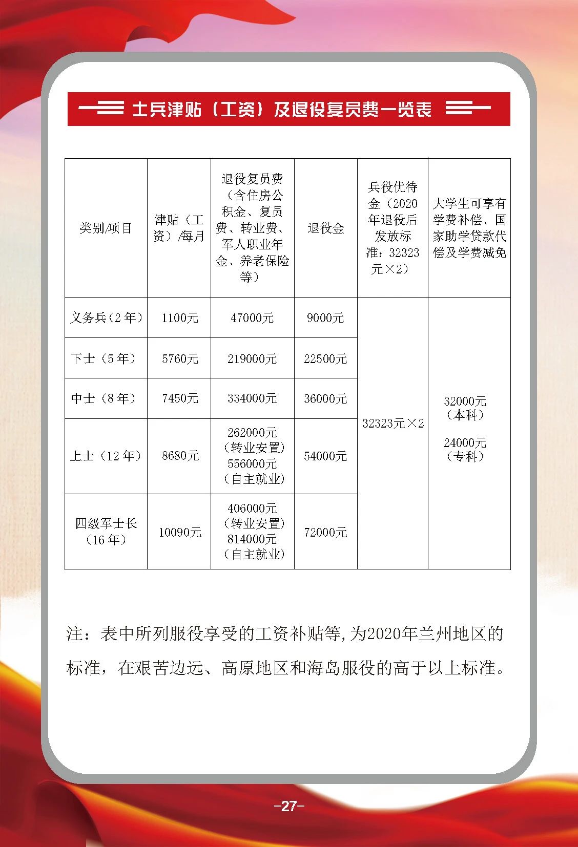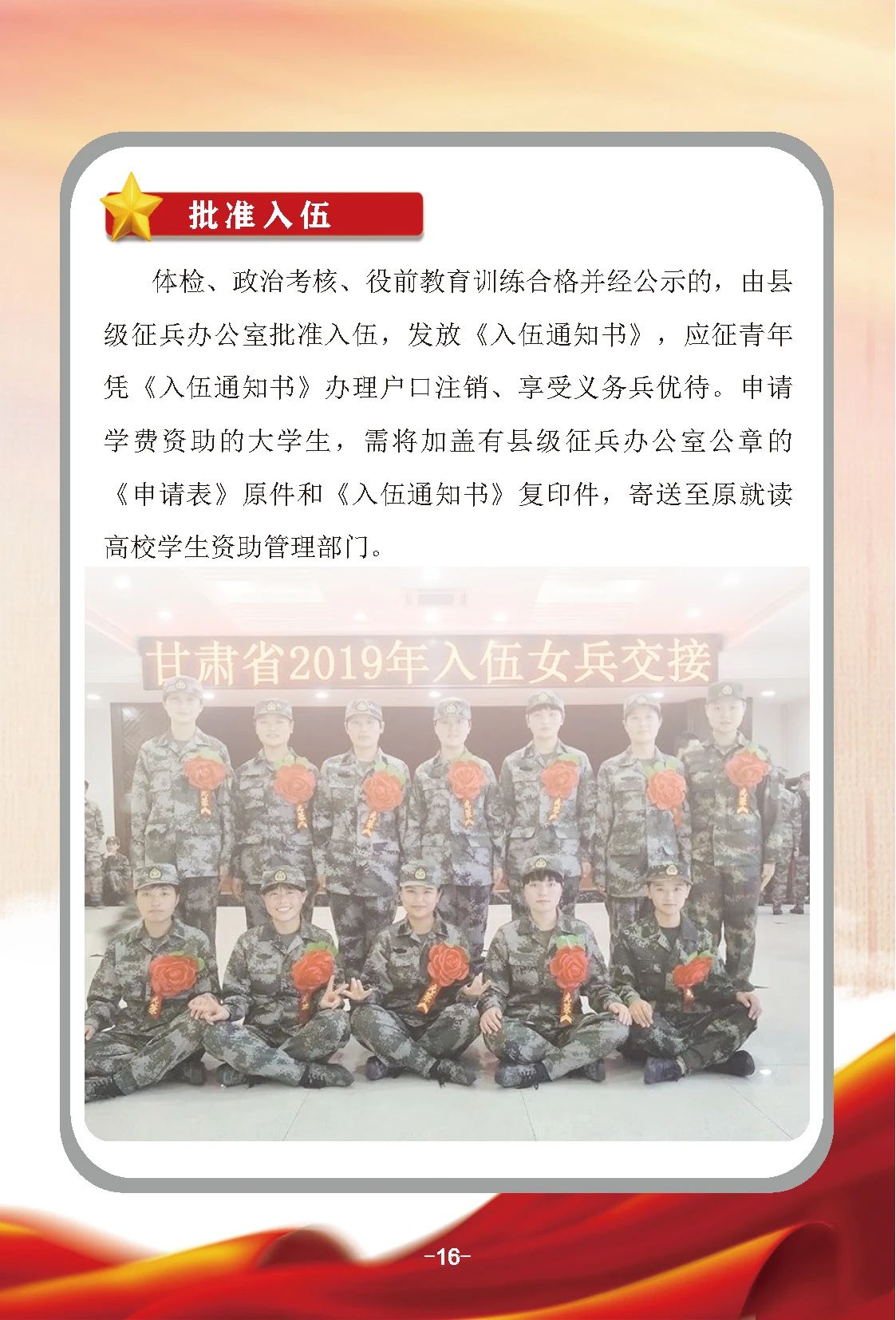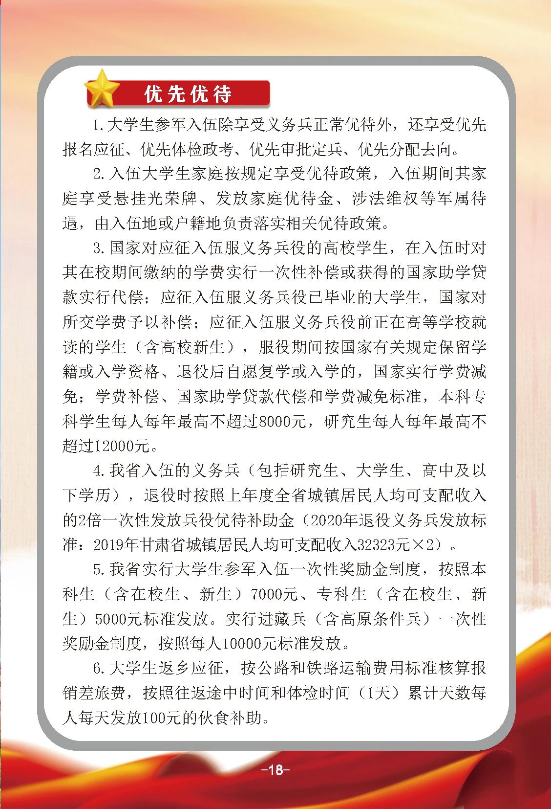 (二)入伍优待方面。一是给予学费补偿代偿。国家按照不同学历,对参军入伍的大学生给予学费补偿和助学贷款代偿。本专科生标准每人每年8000元、研究生标准每人每年12000元,相当于上学费用由国家统一报销。二是发放义务兵家庭优待金。我们甘肃省义务兵优待金标准为退役上年度全省城镇居民人均可支配收入的2倍,以2020年我省退役义务兵为例,兵役优待金为64646元(2019年全省城镇居民人均可支配收入32323元),退伍后一次性发放。三是发放大学生奖励金。我省实行大学生参军入伍一次性奖励金制度,按照本科生(含在校生、新生)7000元、专科生(含在校生、新生)5000元的标准发放。实行进藏兵(含高原条件兵)一次性奖励金制度,按照每人10000元标准发放。综上,大学生入伍,除了成才成长方面,经济上除学费补偿、优待金、奖励金外,加上到部队后的义务兵津贴,相当于服役期间每月领取将近4300余元。