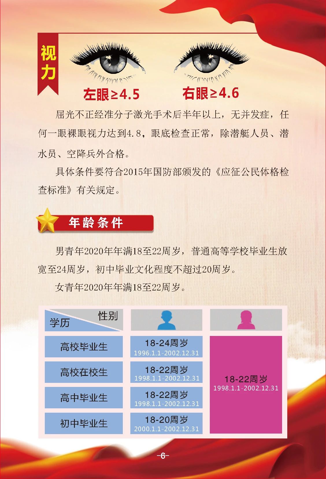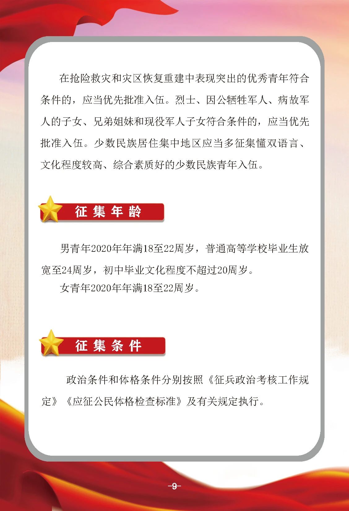 年龄条件。男青年2020年年满18至22周岁(1998年1月1日至2002年12月31日),普通高等学校毕业生放宽至24周岁(1996年1月1日至2002年12月31日),初中毕业文化程度男青年不超过20周岁(2000年1月1日至2002年12月31日)。女青年2020年年满18至22周岁(1998年1月1日至2002年12月31日)。