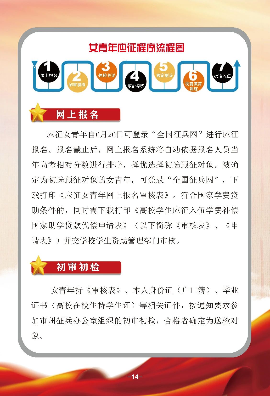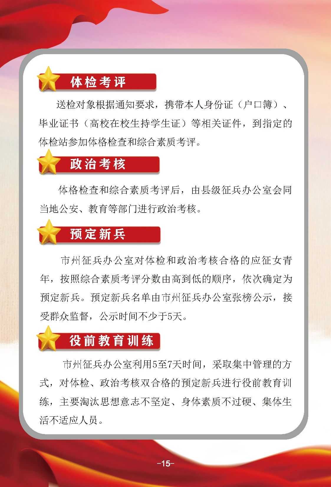 女青年应征入伍程序为:网上报名、初审初检、体格检查、综合素质考评、政治考核、役前教育训练、审批定兵、张榜公示、批准入伍。