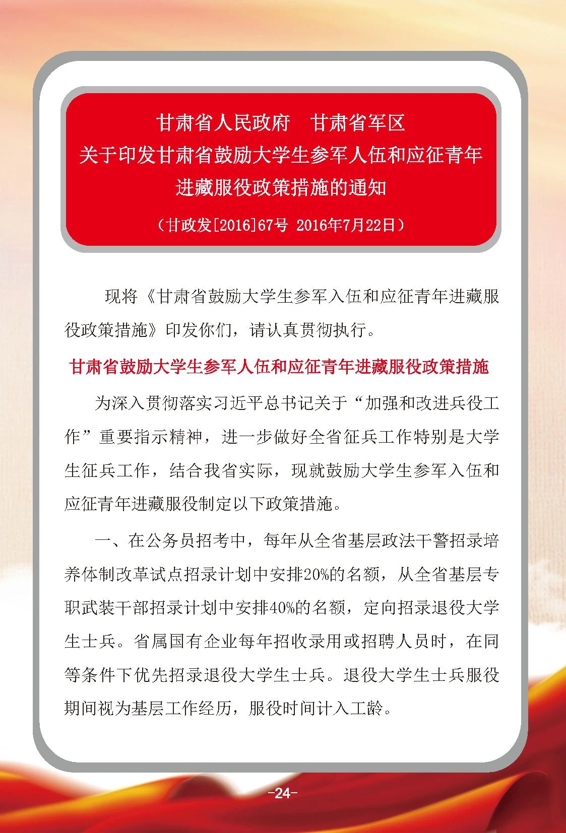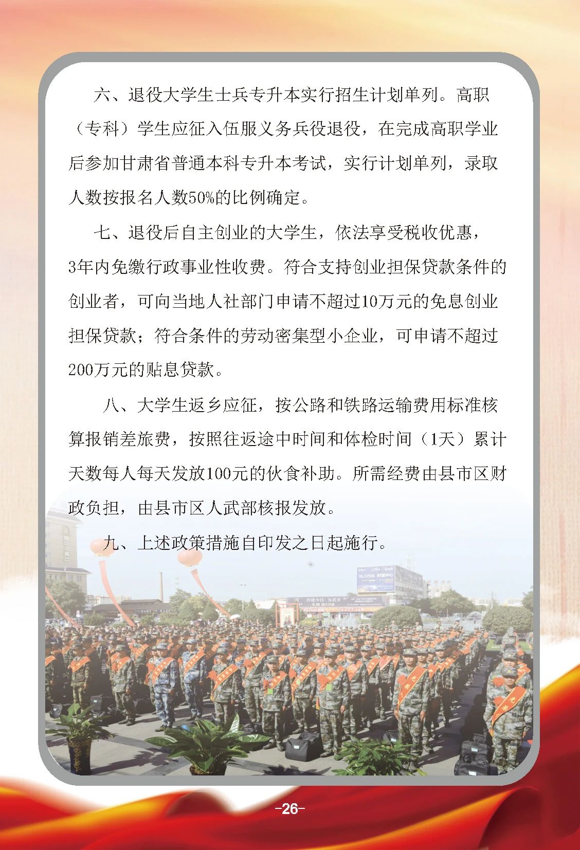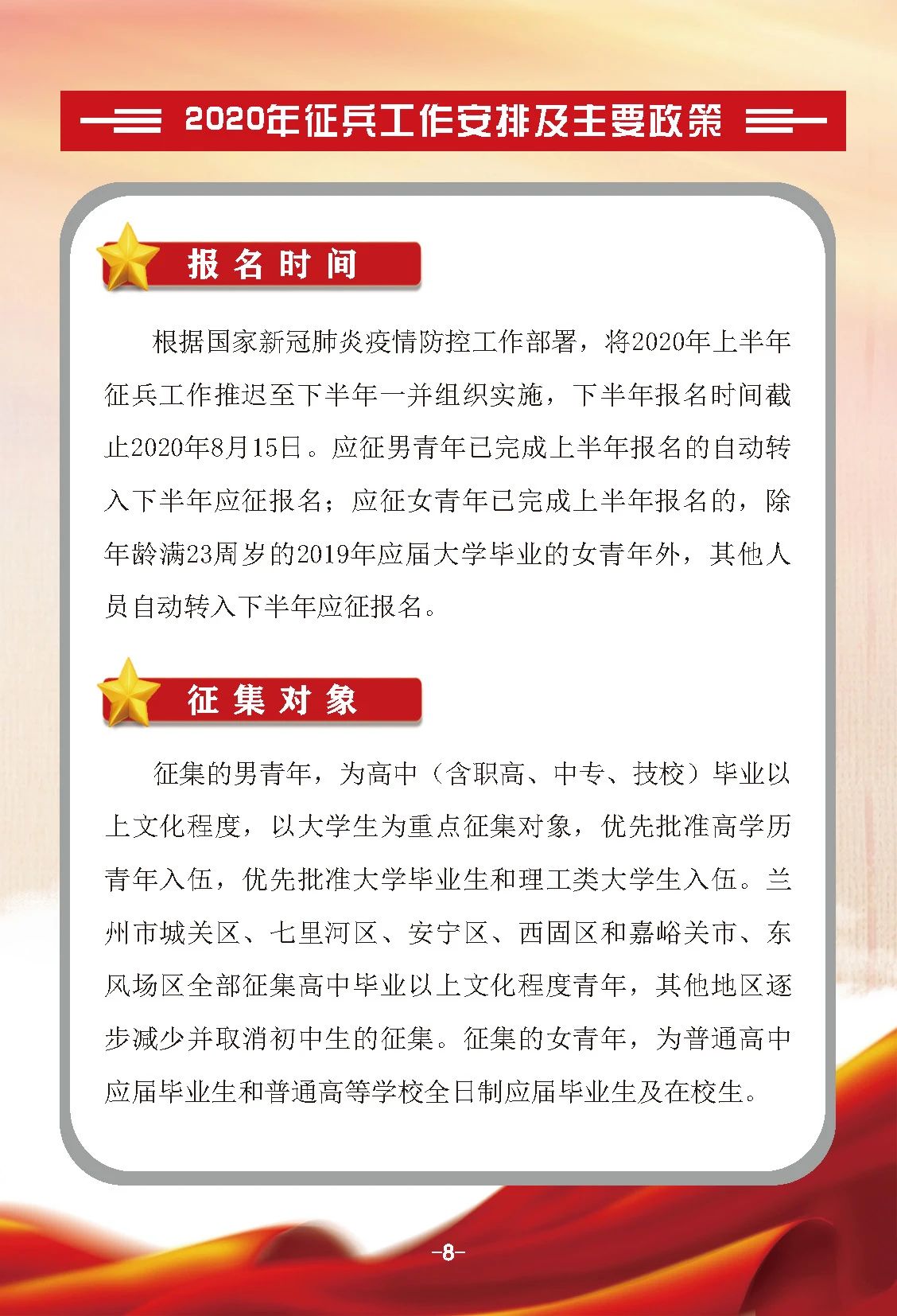 征集的男青年,以高中(含职高、中专、技校)毕业以上文化程度的青年为主,以大学生为重点征集对象,优先批准高学历青年入伍,优先批准大学毕业生入伍。兰州市城关区、七里河区、安宁区、西固区和嘉峪关市、东风场区全部征集高中毕业以上文化程度青年,其他地区逐步减少并取消初中生的征集。