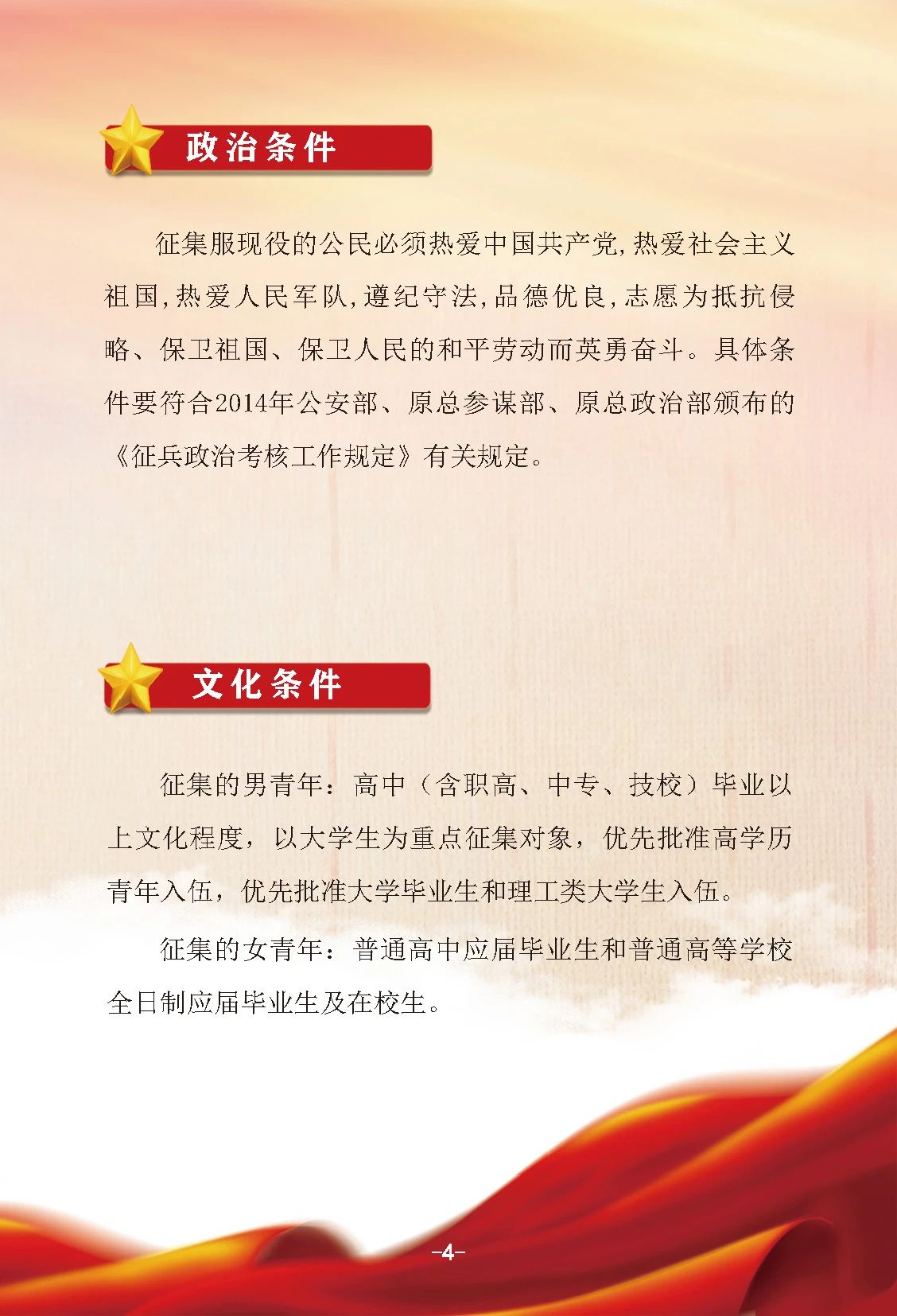 政治条件。按照公安部、原总参谋部、原总政治部《征兵政治考核工作规定》和有关规定执行。征集服现役的公民必须热爱中国共产党,热爱社会主义祖国,热爱人民军队,遵纪守法,品德优良,志愿为抵抗侵略、保卫祖国、保卫人民的和平劳动而英勇奋斗。