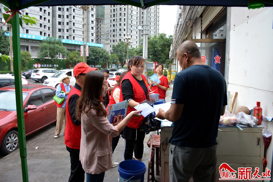 志愿者们在雨中,清理沿街白色垃圾和小广告,并向辖区门店发放“市民应知应会知识”创建文明城市的宣传资料,面对面向居民讲解文明创建知识,倡议居民支持并参与我市文明城市创建活动,争当文明人,争做文明事,以此增强了社区居民对创建全国文明城市重要性的认识,提升了居民对文明城市创建的知晓度和参与度。