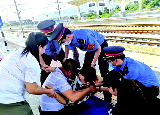 受伤旅客下车 车站人员护送