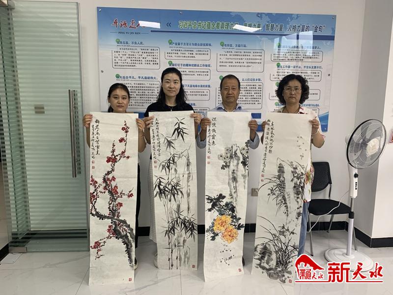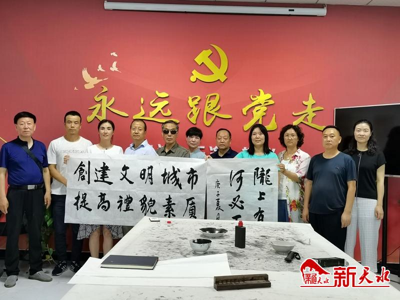 新天水讯【天水日报记者 余碧波】为弘扬国粹,丰富社区的文化氛围,助推全国文明城市创建,2020年8月4日,七里墩街道七里墩社区开展了以“翰墨飘香进社区 挥毫泼墨助创城”为主题的书画活动,在七里墩社区综合文化服务中心举行。邀请了牡丹书画院老师创作交流,他们以文艺志愿者的身份,携手助力全国文明城市创建。