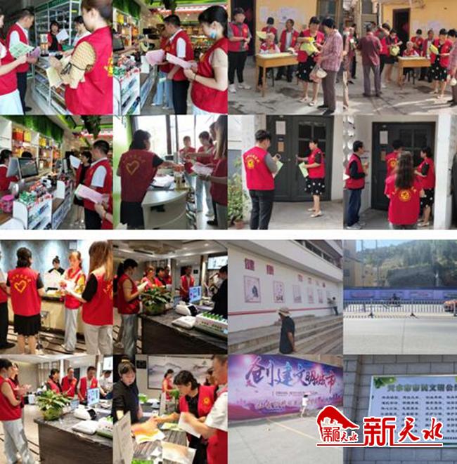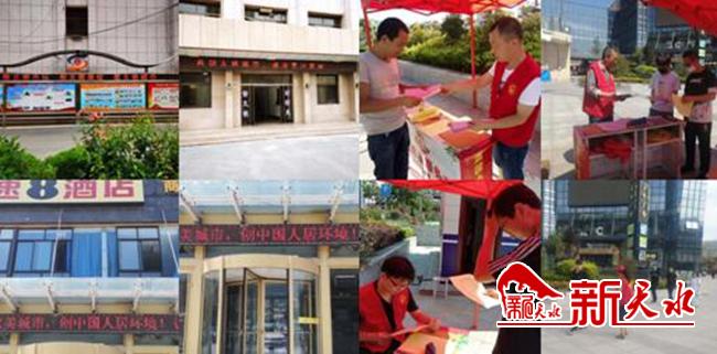 二、凝聚全民力量,展示文明形象。社区采取多种有效形式,积极营造创建全国文明城市浓厚氛围。一是社区工作人员深入辖区主次干道、小区、酒店、商铺等场所采取发放《天水市创建全国文明城市应知应会》宣传单、调查问卷的形式,并在小区单元门张贴宣传单,以此提升社区居民对创建工作的知晓率和认同感。二是为了让全民参与创城工作,瀛池社区积极动员辖区各单位、物业公司,在自己所管辖的路段范围内,制作宣传海报和展板,并动员沿街有IED显示屏的商铺、酒店24小时循环播放有关创城标语,提高广大居民的知晓率。三是在人员流动密集的上亿广场设立雷锋志愿服务岗,并向过往行人发放宣传单,在整个辖区持续营造“创文明城市做文明人”的良好舆论氛围。