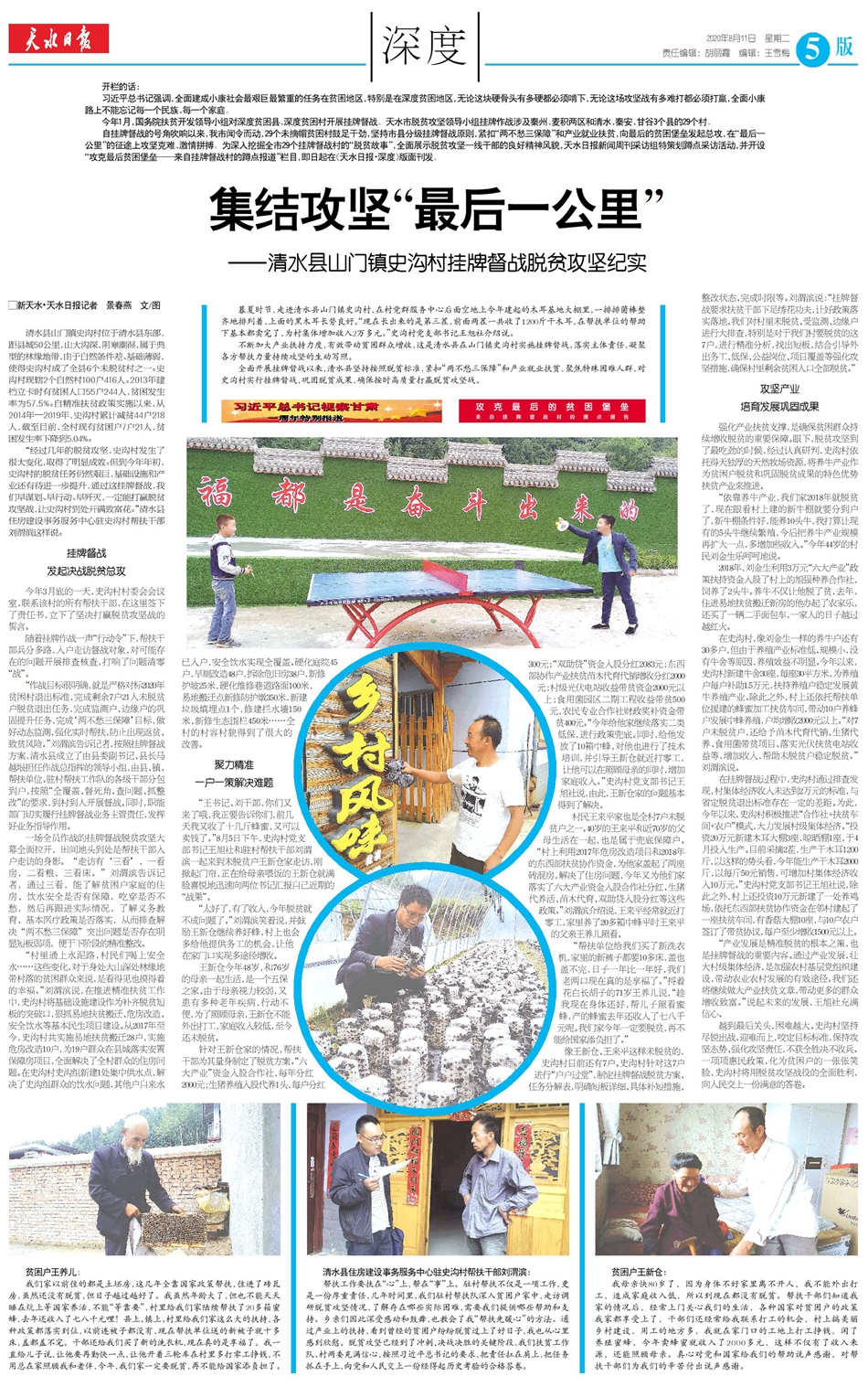自挂牌督战的号角吹响以来,我市闻令而动,29个未摘帽贫困村鼓足干劲,坚持市县分级挂牌督战原则,紧扣“两不愁三保障”和产业就业扶贫,向最后的贫困堡垒发起总攻,在“最后一公里”的征途上攻坚克难、激情拼搏。为深入挖掘全市29个挂牌督战村的“脱贫故事”,全面展示脱贫攻坚一线干部的良好精神风貌,天水日报新闻周刊采访组特策划蹲点采访活动,并开设“攻克最后贫困堡垒——来自挂牌督战村的蹲点报道”栏目,即日起在天水日报社全媒体刊发。