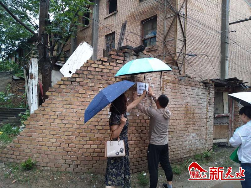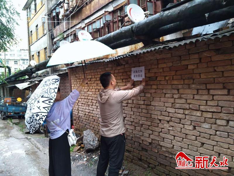 社区工作人员对辖区地势低洼地段进行查看,深入地势低洼路段及老旧房屋进行入户了解情况,并留下社区防汛电话,在危墙上张贴提示,提醒居民暴雨期间注意出行安全,出现紧急情况,及时联系社区。