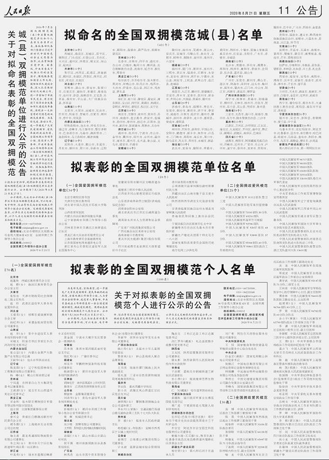 关于对拟命名表彰的全国双拥模范城(县)、双拥模范单位进行公示的公告