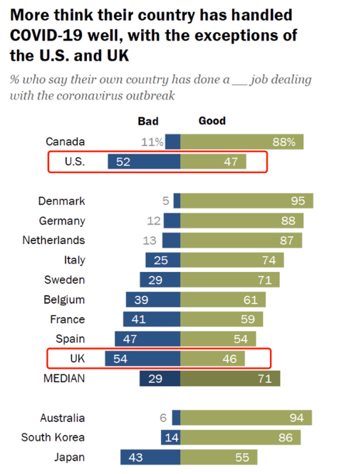 △多数受访者认为他们的国家妥善处理了疫情,但美国和英国除外 图片来源:皮尤研究中心