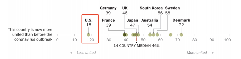 调查显示,只有不到18%的美国受访者表示,现在的美国比疫情前更加团结。这一数据远低于调查结果的平均值46%,也是14个国家中的最后一名。