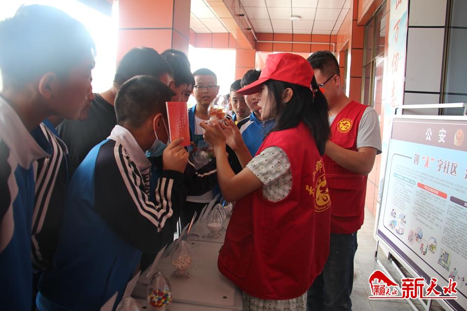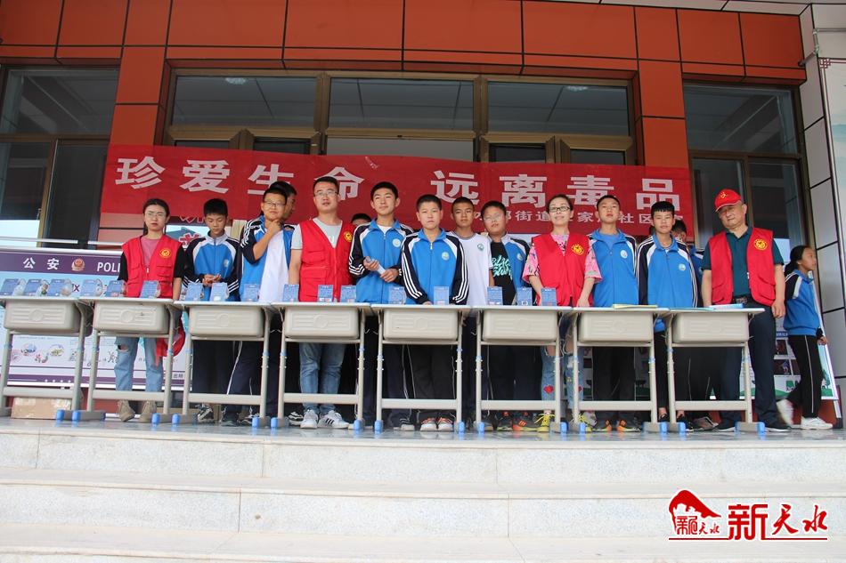 新天水讯【通讯员 吴娟】近年来,吸毒者日趋低龄化已成为整个社会广泛关注的问题。青少年正处于身心快速发展阶段,社会经验积累不多,辨别是非能力有待加强,对社会上各种花样翻新的毒品缺乏系统认识,容易沾染毒品。为了让他们认识毒品的危害,增强自我保护意识,预防毒品犯罪。8月28日下午,王家磨社区新时代文明实践站组织社区工作人员和志愿者走进天水市玉泉中学开展了以“禁毒宣传进校园,上好开学第一课”为主题的禁毒宣传活动。