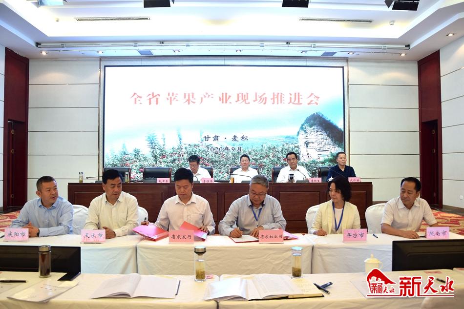 会前,与会人员现场观摩了天水花牛苹果产业园、天水长城果汁10万吨果汁生产线、花牛镇南山万亩花牛苹果基地、麦积区九龙山苹果基地、鑫田果品种植农民专业合作社仓储保鲜库。会上,麦积区、静宁县、宁县、天水勤丰果业有限责任公司、中国农业发展银行甘肃省分行负责人围绕促进苹果产业发展作了交流发言。中国农业发展银行甘肃省分行与苹果主产区政府进行了签约。