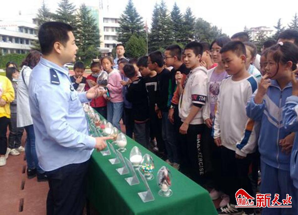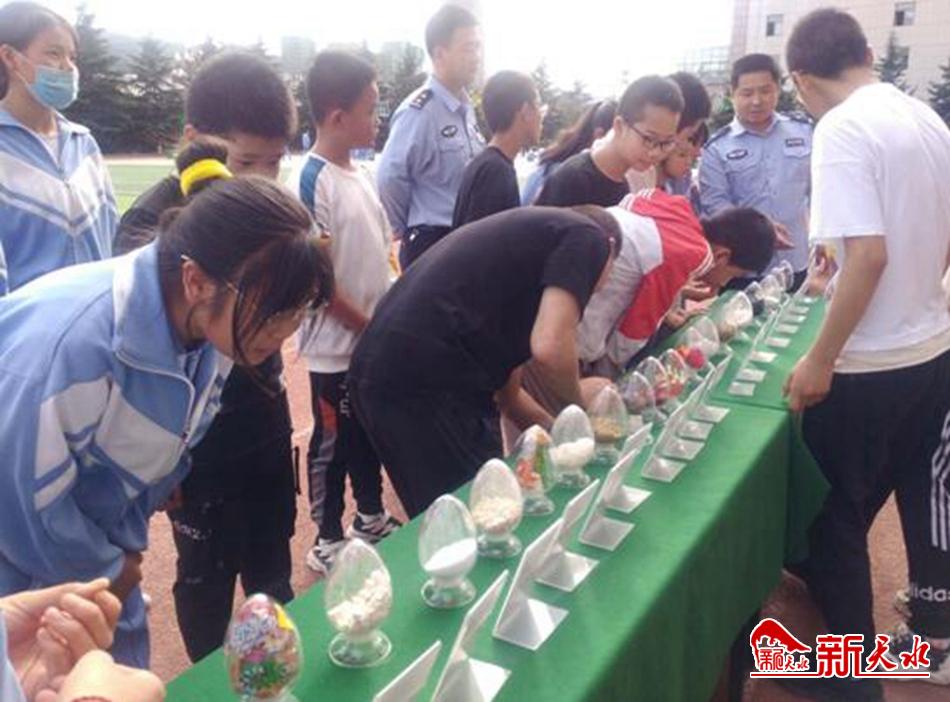 随后在操场上摆放了仿真毒品展台。向学生们更直观地展示了鸦片、白粉、冰毒、摇头丸等20种毒品仿真样品,详细讲解了各类新型毒品、毒品的种类特征、如何识别毒品、怎样预防毒品,并向学生强调一些新型毒品可能伪装成常见的、无害的糕点、糖果、饮料等混入日常生活,令人防不胜防。同学们一边观看一边议论,“原来冰毒长这个样子,以后一定要提高警惕,不乱吃陌生人给的东西”。
