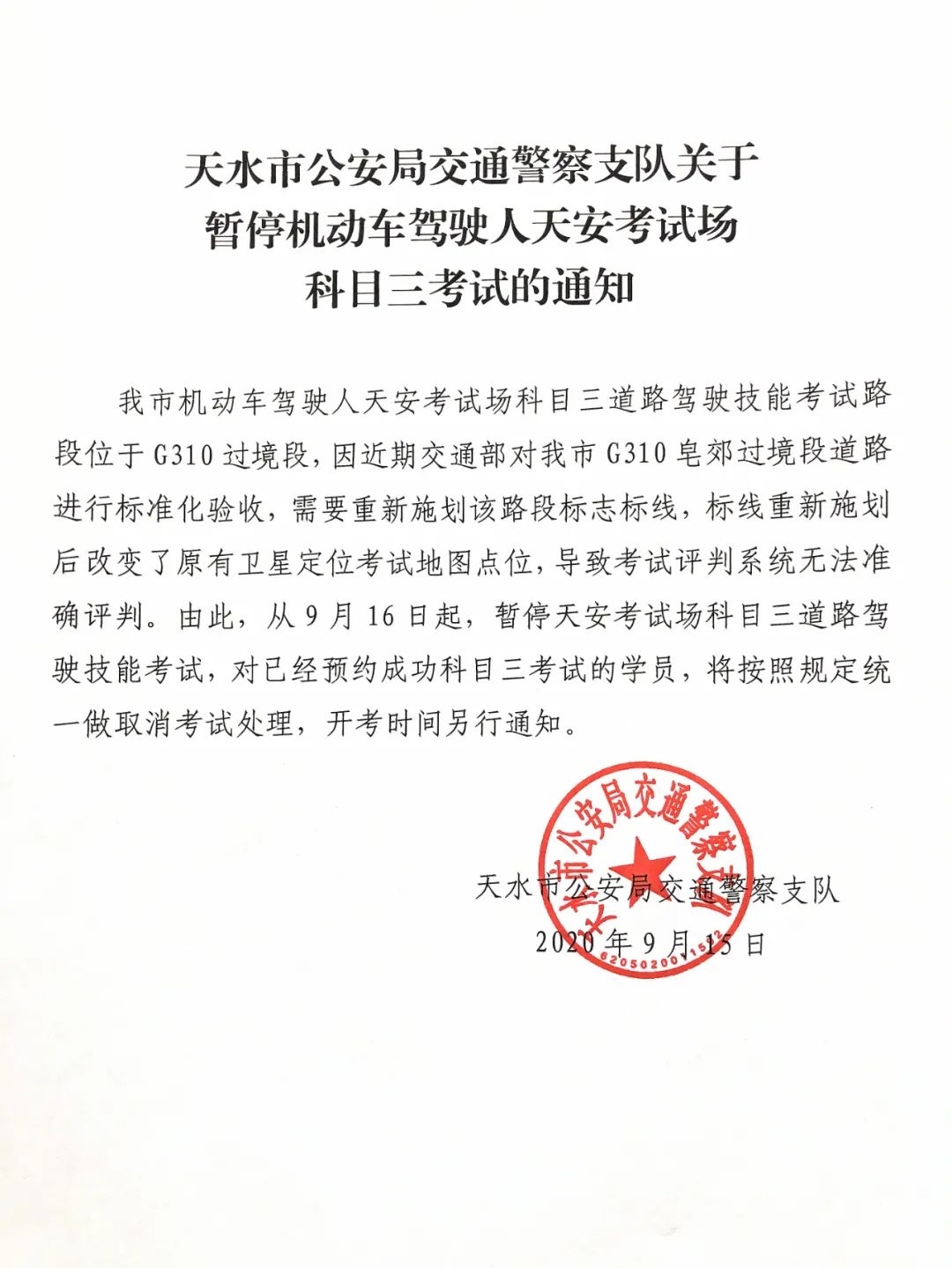 我市机动车驾驶人天安考试场科目三道路驾驶技能考试路段位于G310过境段,因近期交通部对我市G310皂郊过境段道路进行标准化验收,需要重新施划该路段标志标线,标线重新施划后改变了原有卫星定位考试地图点位,导致考试评判系统无法准确评判。由此,从9月16日起,暂停天安考试场科目三道路驾驶技能考试,对已经预约成功科目三考试的学员,将按照规定统一做取消考试处理,开考时间另行通知。天水市公安局交通警察支队