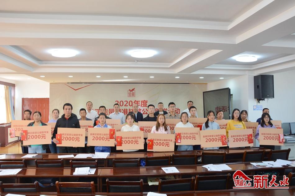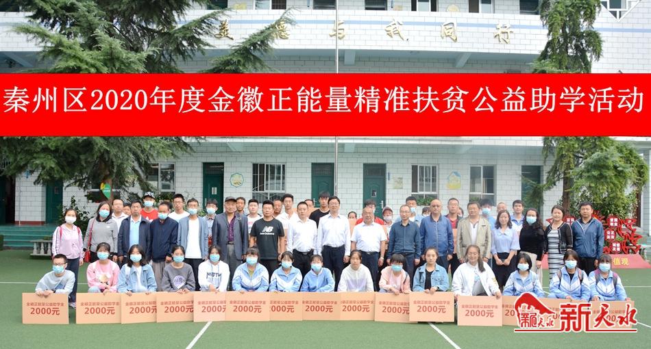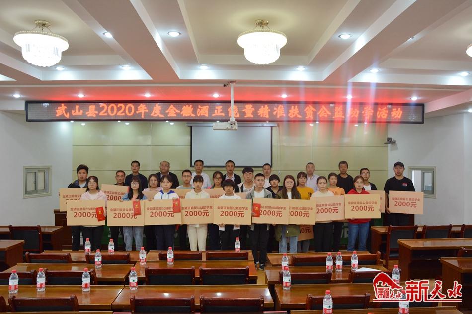 助学金发放仪式上,金徽正能量公益基金会、金徽酒业股份有限公司为我市秦州区30名、麦积区33名、武山县20名、甘谷县30名,秦安县33名,清水县20名,张家川县22名共计188名贫困家庭大一新生进行资助,为每人一次性资助2000元,资助金额达376000万元。