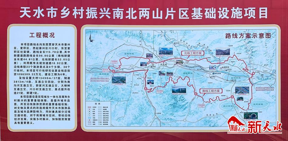 天水市乡村振兴南北两山片区基础设施项目贯穿秦州区、麦积区,西起秦州区川口村、东至麦积区社棠镇。建设内容包括新建二级公路96.86公里,全线设大桥37座,隧道4座,互通立交4处;新建和提升改造景点设施23处。估算总投资109.63亿元。建设期6年。
