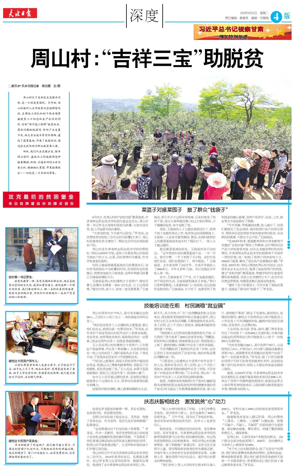 周山村位于麦积区五龙镇东北部,是一个深度贫困村。今年初,周山村被列入全市脱贫攻坚挂牌督战村,在帮扶工作队和村干部准确掌握脱贫人口动态和生产状况的同时,对标“两不愁三保障”脱贫标准,聚焦问题短板弱项,针对产业发展不足、缺乏专业技术等实际困难,建成了蔬菜基地,开展了技能培训,通过扶志扶智助力群众脱贫奔小康。