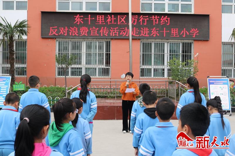 新天水讯 新学期伊始,东十里社区走进东十里小学开展“厉行节约,反对浪费”主题教育活动。培育学生从小养成“厉行节俭,反对浪费”的良好生活习惯,努力在校园营造“浪费可耻、节约为荣”的浓厚氛围。