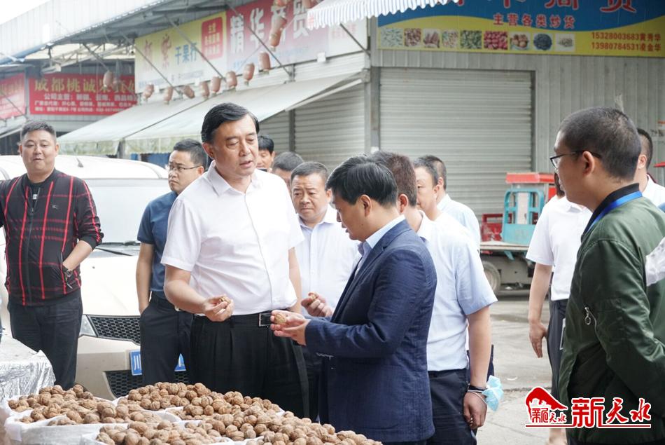 雨润四川国际农产品交易中心是农业部八大重点批发市场之一。24日下午,考察团一行首先到雨润四川国际农产品交易中心进行考察。赵卫东边走边看,详细了解该市场中苹果、核桃、花椒、辣椒等农产品和“花牛”苹果销售情况,并与雨润四川国际农产品交易中心负责人进行座谈交流。