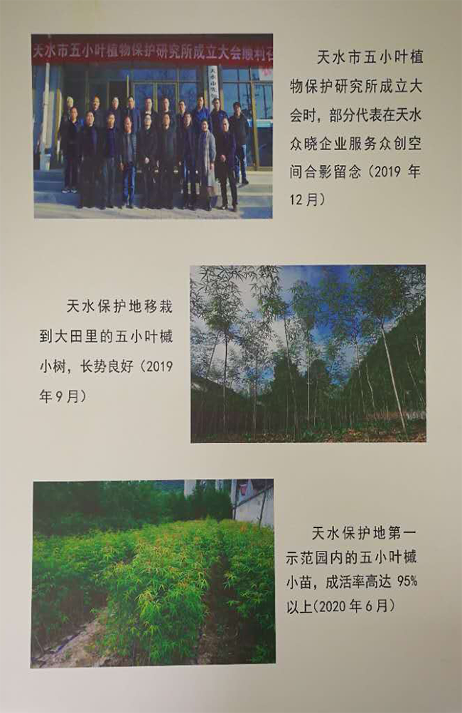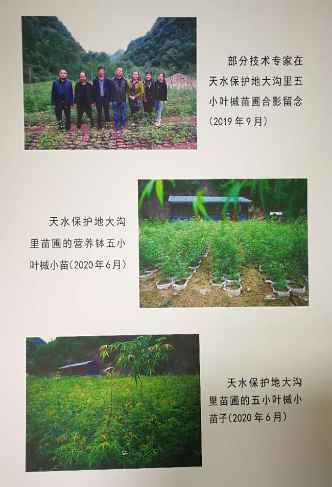 功夫不负有心人,经过十年努力,鲁成代的辛勤汗水终于换来回报,五小叶槭不但在天水繁育成功,出苗率上升到30%,成活率达95%,而且种植规模扩大到30多亩,数量增加到3万多株。更惊喜的是,当五小叶槭在天水繁育成功的消息传开后,引起植物界专家和学者的高度关注,中国生物多样性保护与绿色发展基金会(简称“绿发会”),迅速组织专家实地调研,并专门设立了中华五小叶槭天水保护地,鲁成代全面负责保护地工作。2019年6月,北京举办的世界园艺博览会上,天水保护地送去的五小叶槭获得大会铜奖。今年7月,天水保护地的五小叶槭种子特性测定及繁殖试验研究项目,获中国绿发会杰出奖。最近,北京一位专家从鲁成代提供的五小叶槭种子和叶子里面,成功提取出一种神经酸油,可用于治疗老年痴呆症,为极危物种造福人类提供了佐证。天水市对一个普通农民积极抢救国家极危物种的行为非常重视,去年12月批准成立了“天水市五小叶植物保护研究所”,以利于极危物种枯木逢春、枝繁叶茂。