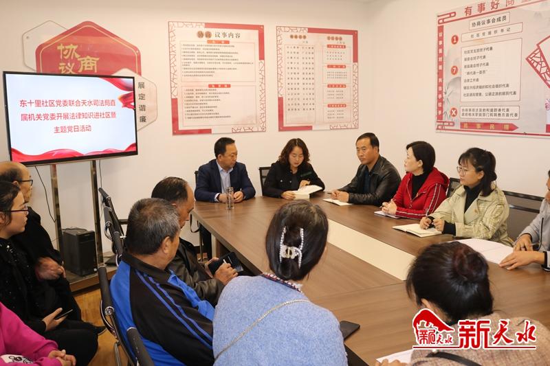 新天水讯 为了不断推动“不忘初心、牢记使命”主题教育成果各项任务落地见效,教育引导广大党员不忘初心、牢记使命。10月10日,东十里社区党委联合天水市司法局直属机关党委开展了“主题党日”活动,辖区东十里小学在职党员积极参加了此次活动。