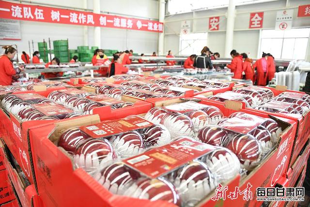 在天水麦积区东柯河工业园区花牛苹果产业园里,一个个红彤彤的苹果经过分拣、包装,再装运到一辆辆配备冷藏设施的大货车上,准备发往北京、浙江、广州等地。