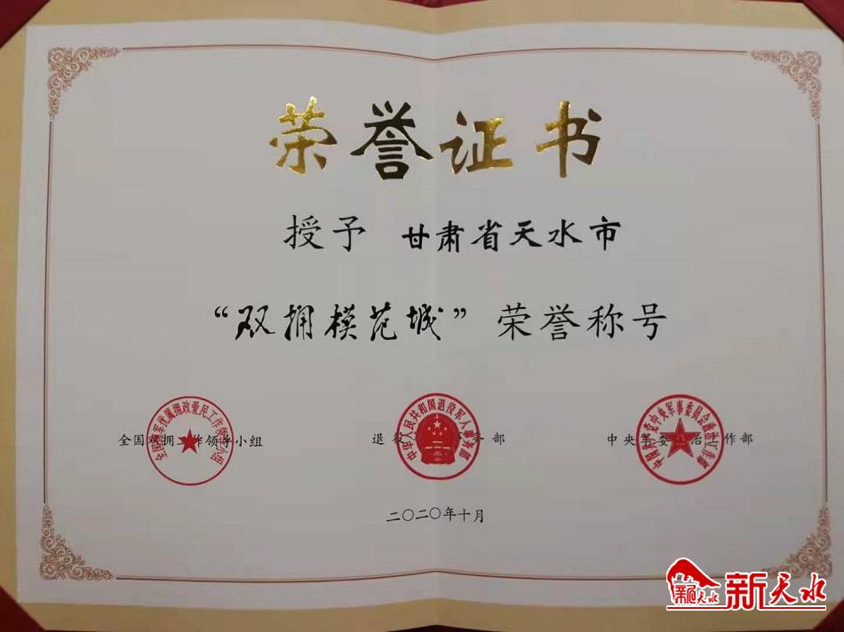 10月20日,全国双拥模范城(县)命名暨双拥模范单位和个人表彰大会在北京举行。在受表彰的411个全国双拥模范城(县)中,天水市名列其中,荣获全国双拥工作领导小组、退役军人事务部、中央军委政治工作部共同命名的“全国双拥模范城”荣誉称号,这也是天水市自2000年获得全国双拥模范城殊荣以来,第六次获得“全国双拥模范城”称号。