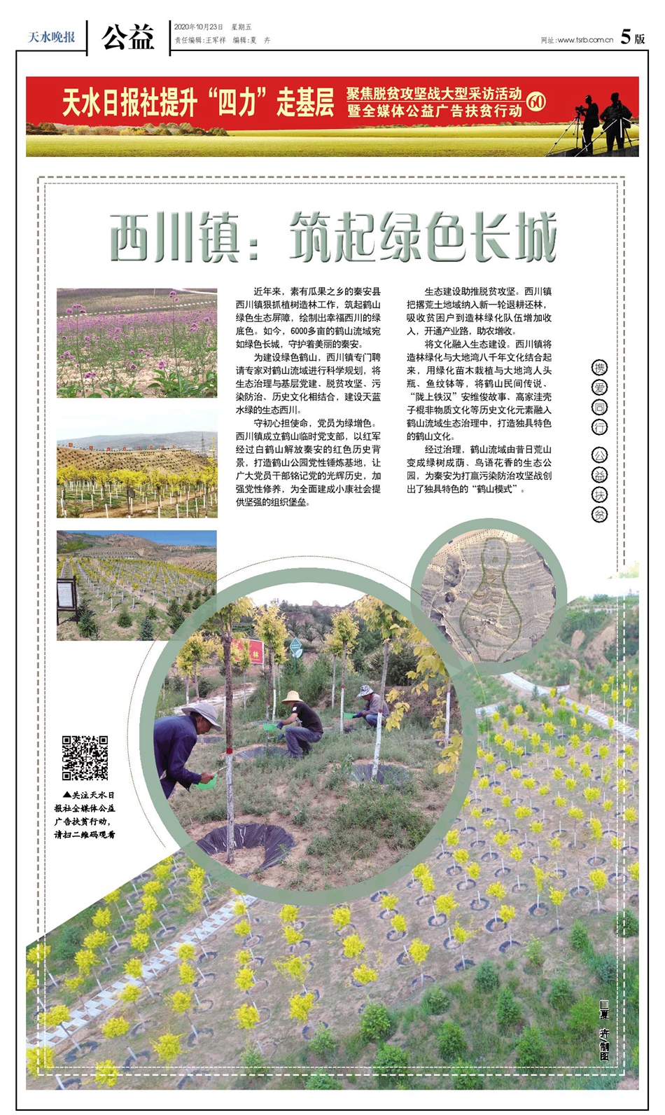 素有瓜果之乡的秦安县西川镇,大力改善生态环境,狠抓绿色造林工作,在鹤山流域筑起6000多亩的绿色生态屏障,绘出绿色西川幸福西川新蓝图。