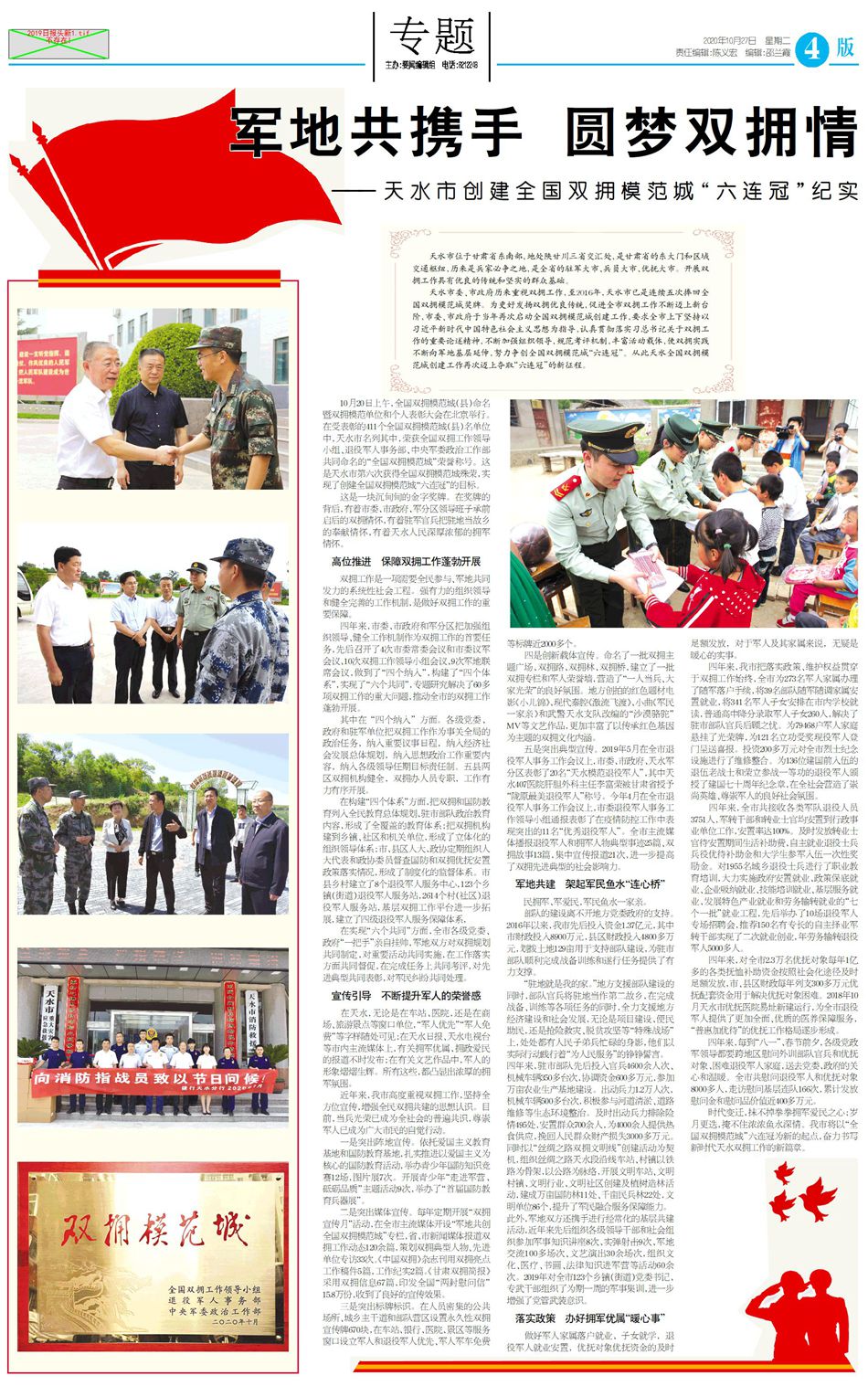 10月20日上午,全国双拥模范城(县)命名暨双拥模范单位和个人表彰大会在北京举行。在受表彰的411个全国双拥模范城(县)名单位中,天水市名列其中,荣获全国双拥工作领导小组、退役军人事务部、中央军委政治工作部共同命名的“全国双拥模范城”荣誉称号。这是天水市第六次获得全国双拥模范城殊荣,实现了创建全国双拥模范城“六连冠”的目标。