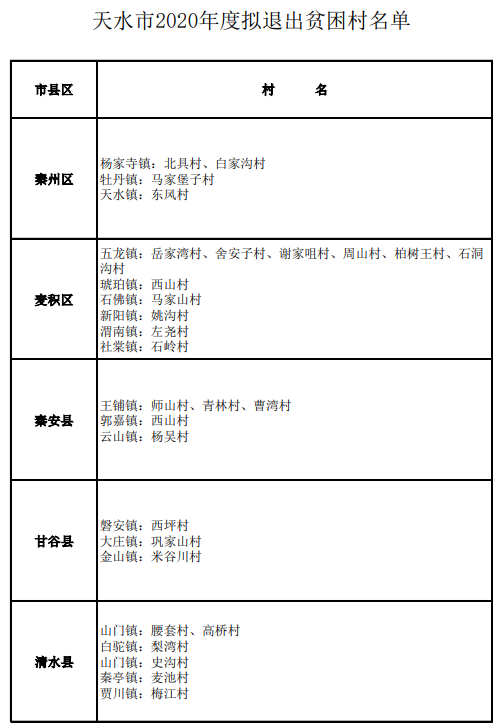 根据《甘肃省精准脱贫验收标准及认定程序》确定的贫困村退出验收程序,市脱贫攻坚领导小组抽调市人大代表、市政协委员、市民主党派人士和市直行业部门业务骨干组成市贫困退出和脱贫成果检视抽查验收组,对各县区上报的拟退出贫困村,在市直行业部门单项验收和认定的基础上,严格按照贫困村退出的各项指标,逐村逐项实地进行了全面验收。经市脱贫攻坚领导小组审核,市政府批准秦州区杨家寺镇白家沟村等29个贫困村退出。现进行公告,接受社会监督,如有异议,请从即日起5个工作日内向市脱贫攻坚领导小组办公室提出意见。