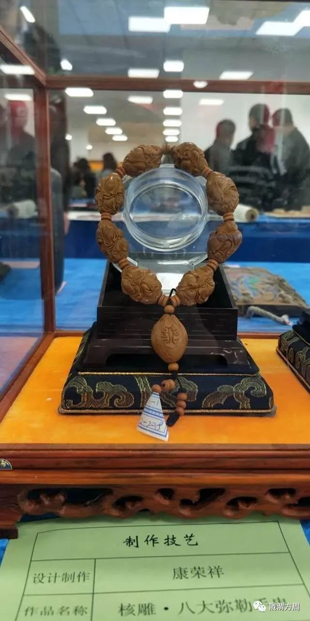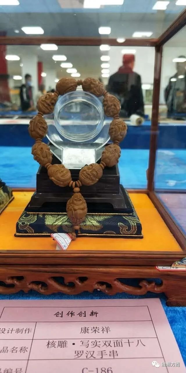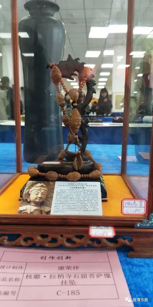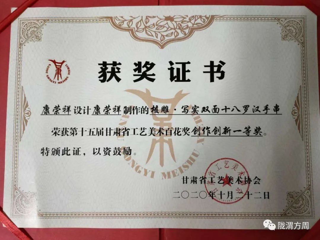 武山洛门籍核微雕艺人,武山县民间文艺家协会理事、甘肃省工艺美术协会会员康荣祥,其设计并制作的橄榄核微雕《双面十八罗汉手串》、《拉梢寺石窟菩萨像挂坠》、《八大弥勒手串》分别荣获创新创作一等奖、创新创作二等奖、制作技艺三等奖;