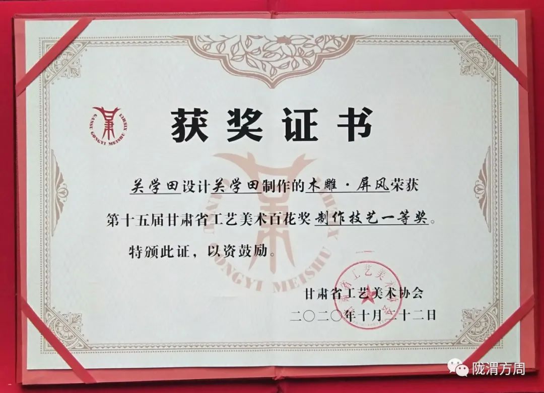 武山滩歌籍木雕、泥塑彩绘艺人,武山县民间文艺家协会理事、甘肃省工艺美术协会会员、甘肃省民间文艺家协会会员关学田,其设计并制作的木雕《屏风》、《东方韵》分别荣获制作技艺一等奖、创新创作二等奖;