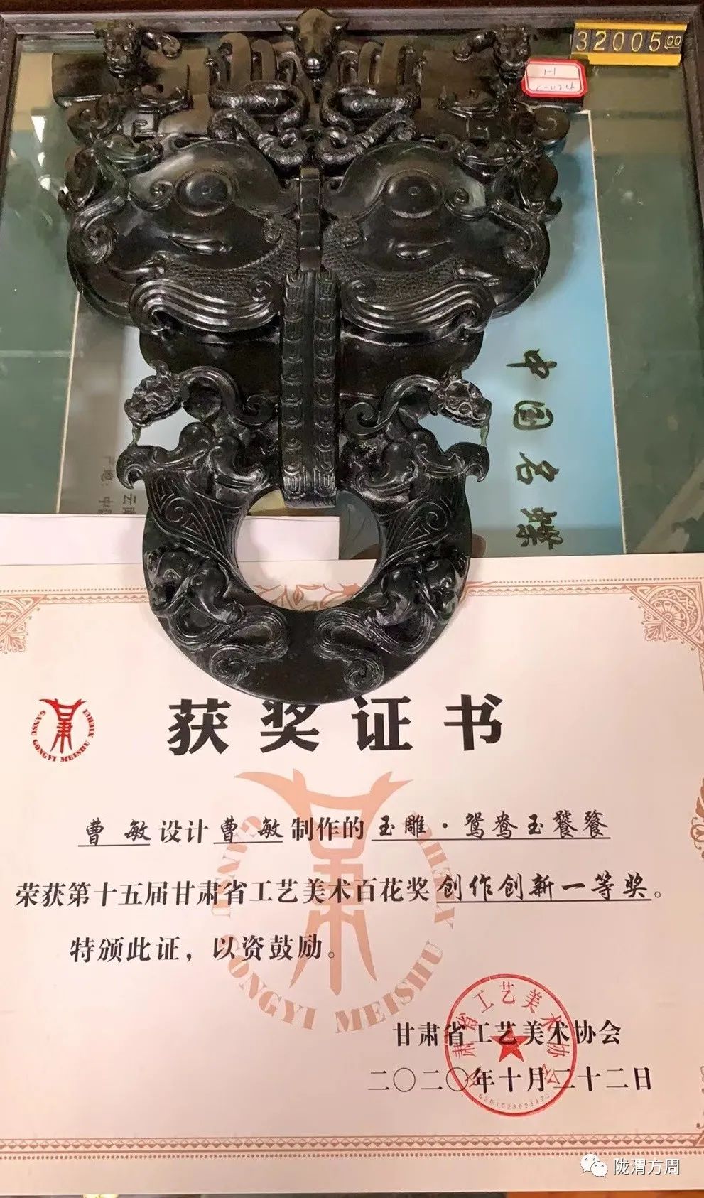 武山籍玉雕艺术家、经营家、武山鸳鸯玉艺术家协会名誉主席、甘肃省工艺美术协会副会长、甘肃莹豪玉文化发展(集团)有限公司董事长曹敏,其设计并制作的玉雕《鸳鸯玉饕餮 [tāo tiè]》荣获创新创作一等奖。
