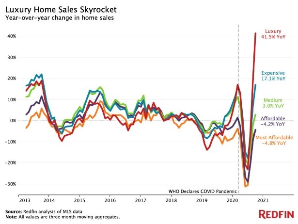 据房地产经济网站Redfin统计,第三季度,美国豪宅销售同比增长41.5%,是自2013年以来的最大涨幅。中等价位房屋的销售额仅增长了3%,经济适用房的销售额则下降了4.2%(下图),显示“疫情经济”对穷人的打击更大,也赤裸裸地展示着富人的财富增值。据《福布斯》最新统计,美国最富有的400人身家已达到创纪录的3.2万亿美元,比一年前增加了2400亿美元。前20人的财富总和为1.3万亿美元,同比增长21%。(注:豪宅通常指各地市场售价最高5%的住宅)