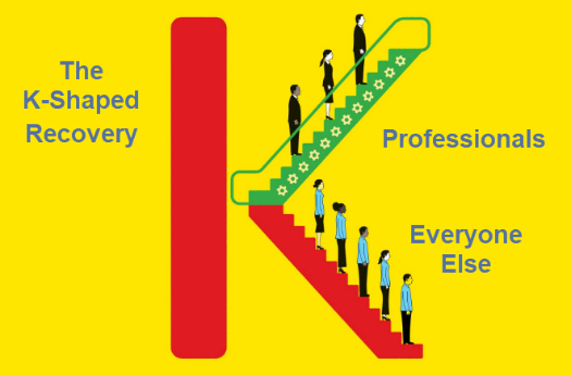 大型科技公司以及高薪专业人士似乎已经适应“疫情经济”,甚至比以前的日子更好过,哈佛大学的研究团队发现,高薪就业岗位已经恢复到疫情前的水平,对于他们来说经济衰退已经结束;低收入群体则是另一番景象,与疫情前相比,低薪(年收入低于2.7万美元)岗位已经流失20%,而且未见恢复的迹象。所以,对当前经济复苏最形象解释就是,一部分人在上楼梯,而另一部分人则在下楼,构成了一个大写的“K”(下图),也就是很多专家称的“K”形复苏。