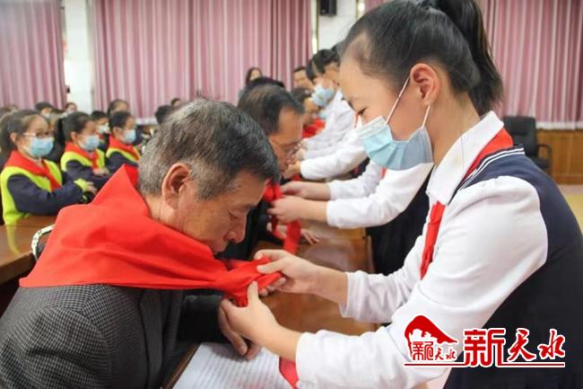 随后,在国歌声中拉开了革命英雄故事宣讲活动的帷幕。少先队员代表向参加过抗美援朝的刘爷爷及社区“五老”佩戴红领巾,眼神中充满了无比的敬意。