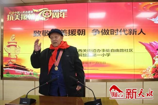 新天水讯 为纪念抗美援朝70周年,弘扬革命精神和爱国主义精神,增强青少年的爱国意识,11月3日下午,自由路社区新时代文明实践站邀请抗美援朝老英雄、社区“五老”走进解一小学宣讲革命故事,教育孩子们要珍惜当前幸福生活,好好学习,报效祖国。