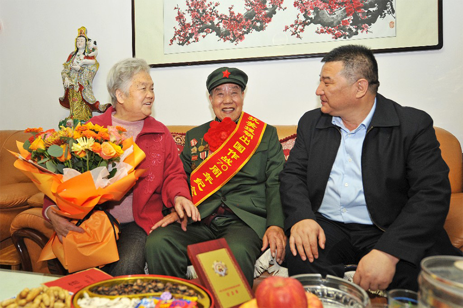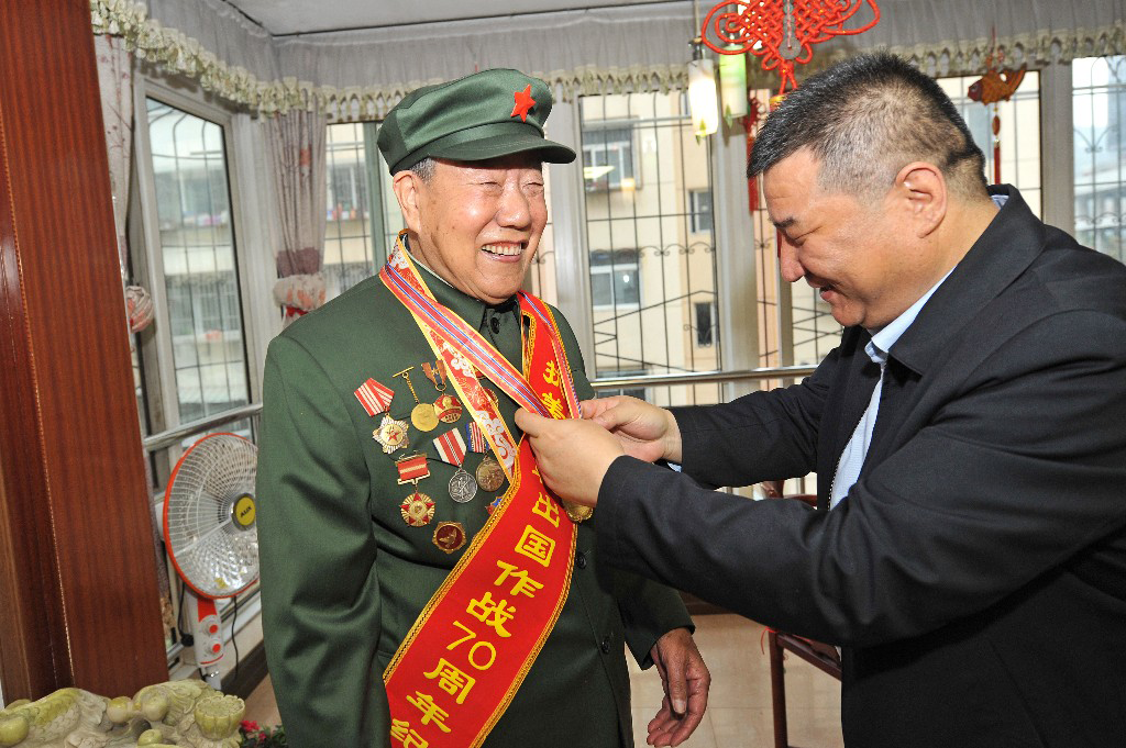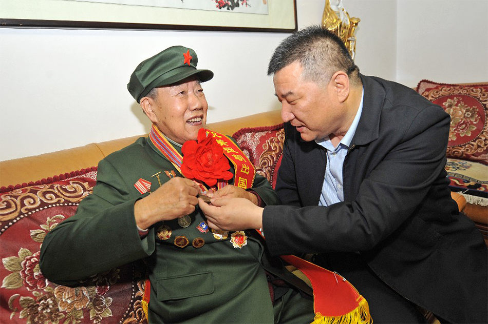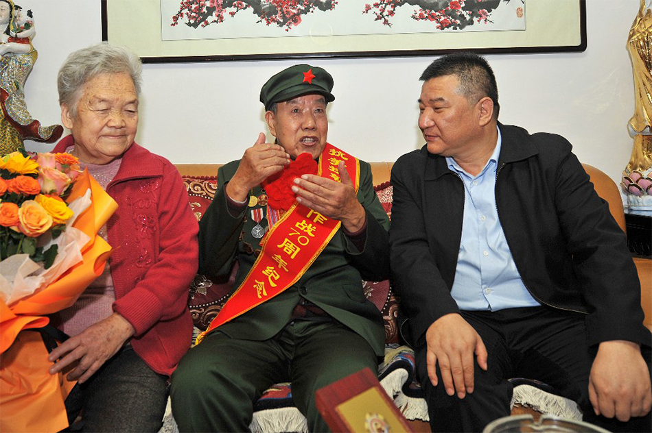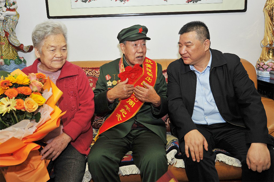 11月5日,天水市税务局党委书记、局长李涛走访慰问天水税务系统抗美援朝志愿军老战士陈福奎,为他佩戴"中国人民志愿军抗美援朝出国作战70周年纪念章"。