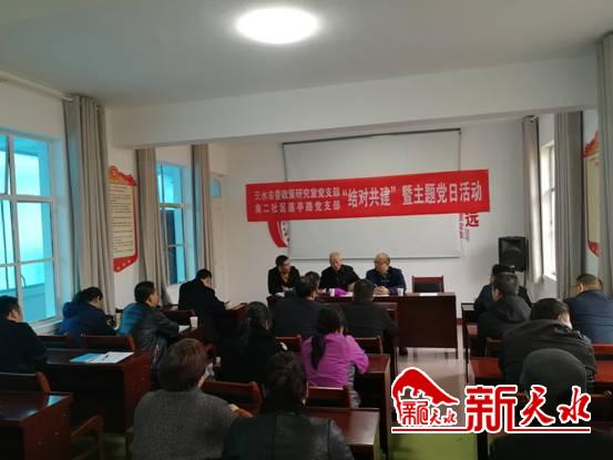 新天水讯【天水晚报记者 张玉平】 近日,秦州区石马坪街道南二社区莲亭路党支部和市委政策研究室党支部开展了主题为“结对共建”暨11月主题党日活动,南二社区莲亭路支部和市委政策研究室支部全体党员参加了此次活动。
