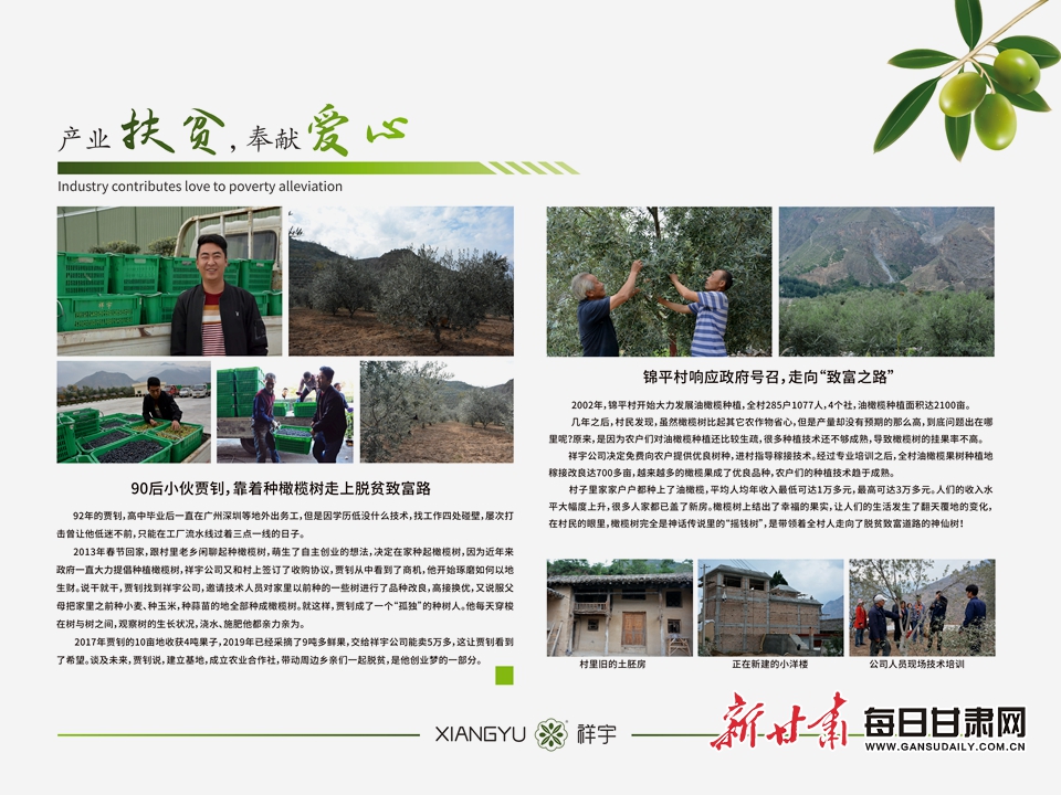 “我家买了车,还在城里为儿女买了房子。下一步,我想通过种植油橄榄把周围的村民和亲戚朋友都带动起来,让大家一起过上好日子。”11月10日晚,在陇南市祥宇油橄榄开发有限责任公司产品展厅里,来自武都区桔柑乡贺家坪村55岁的油橄榄种植户潘小林,向记者讲述自己种植油橄榄脱贫致富的故事。