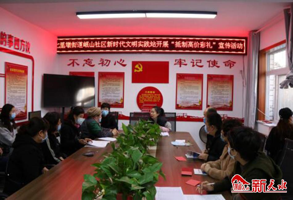 新天水讯 【通讯员 闫迪】为推进社会主义核心价值观落细落小落实,培育形成正确的婚姻观,进一步推进社区风气好转,着力营造风清气正、文明节俭的良好社会风尚。近日,秦州区七里墩街道办岷山社区新时代文明实践站以“抵制高价彩礼 由我带头”为主题开展了移风易俗宣传活动。