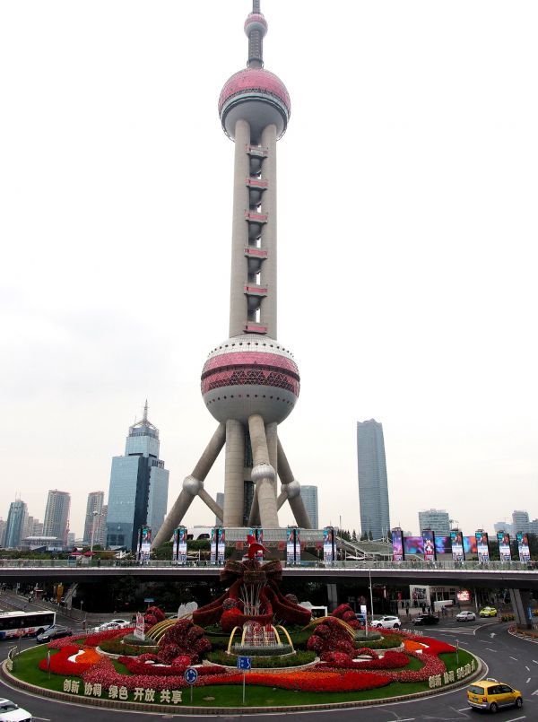 上海浦东陆家嘴环岛中央设立的“浦东开发开放30周年”大型立体花坛。(陈飞 摄)