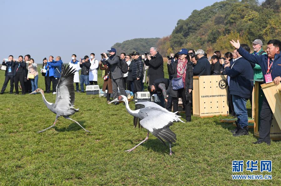 2019年12月8日,国内多家野生动物保护机构在江西鄱阳湖国家级自然保护区将120只被救治的珍稀候鸟成功放飞。这是工作人员放飞两只白枕鹤。新华社记者 万象 摄